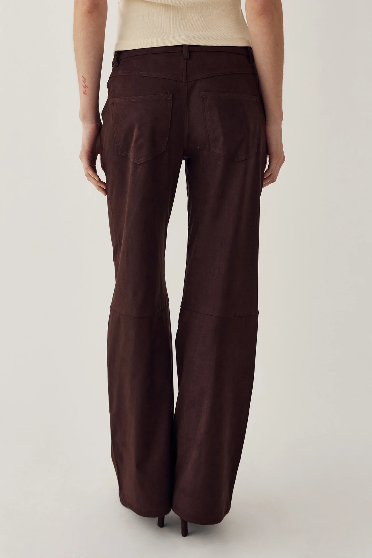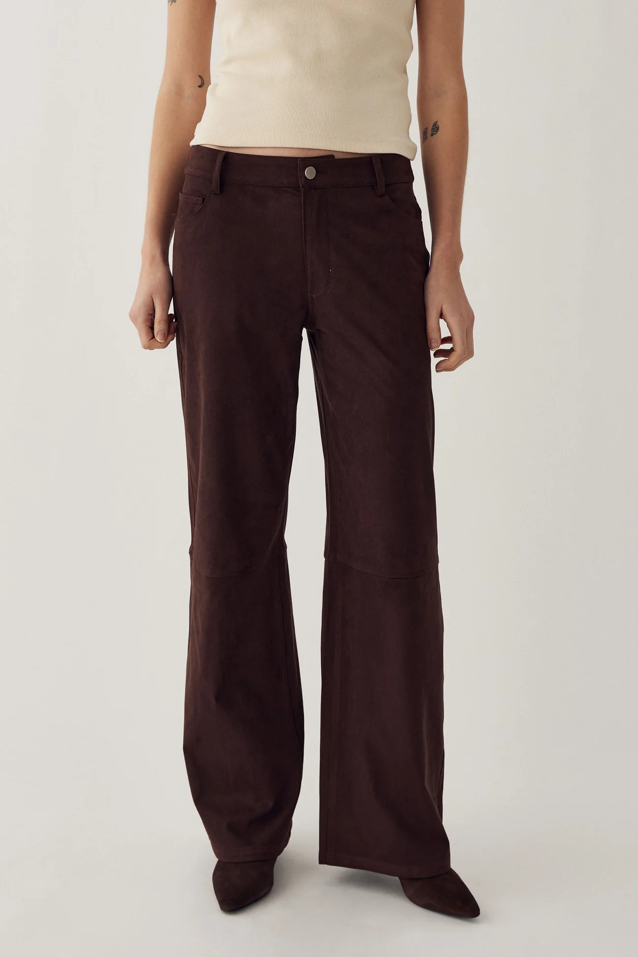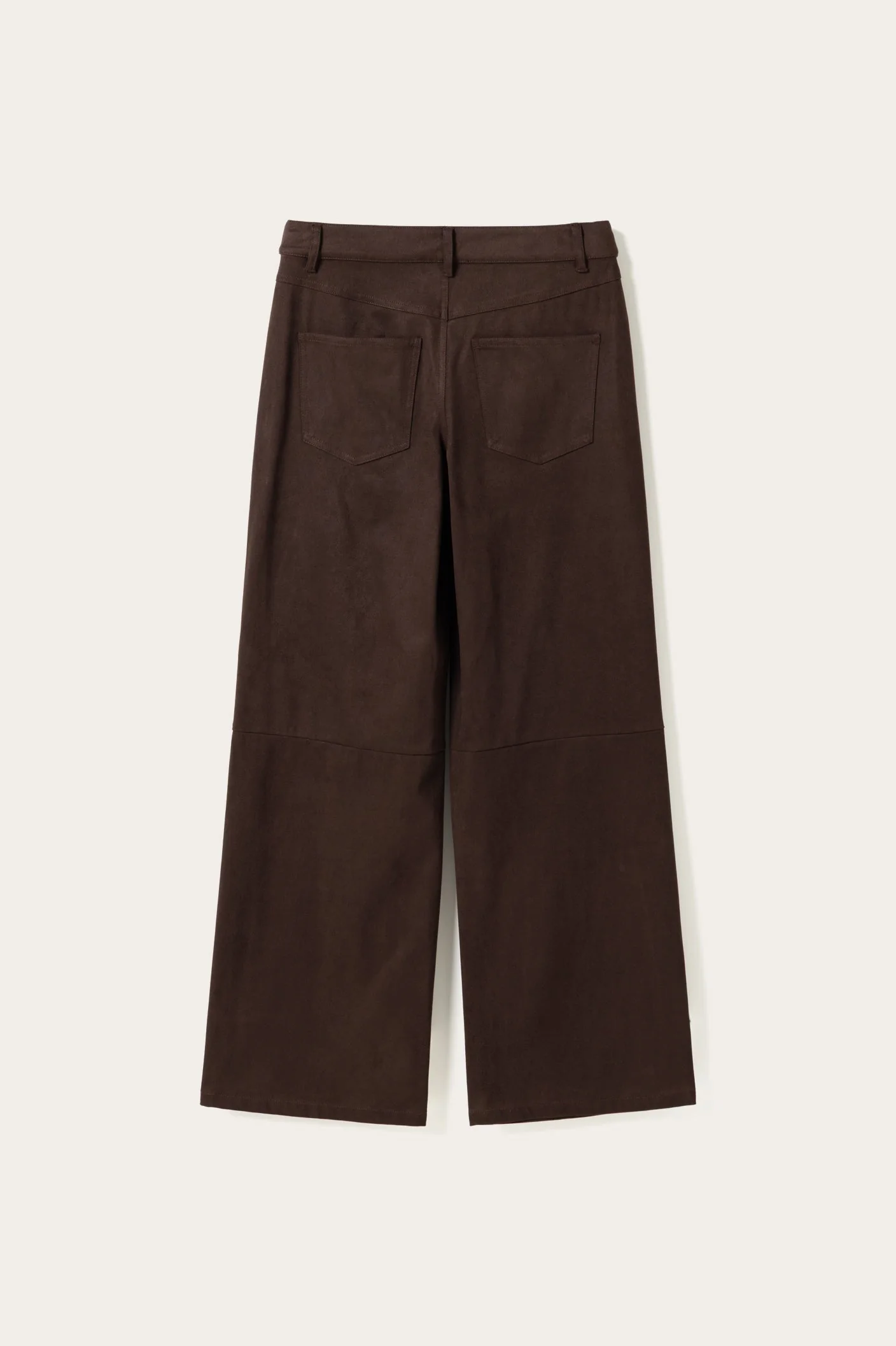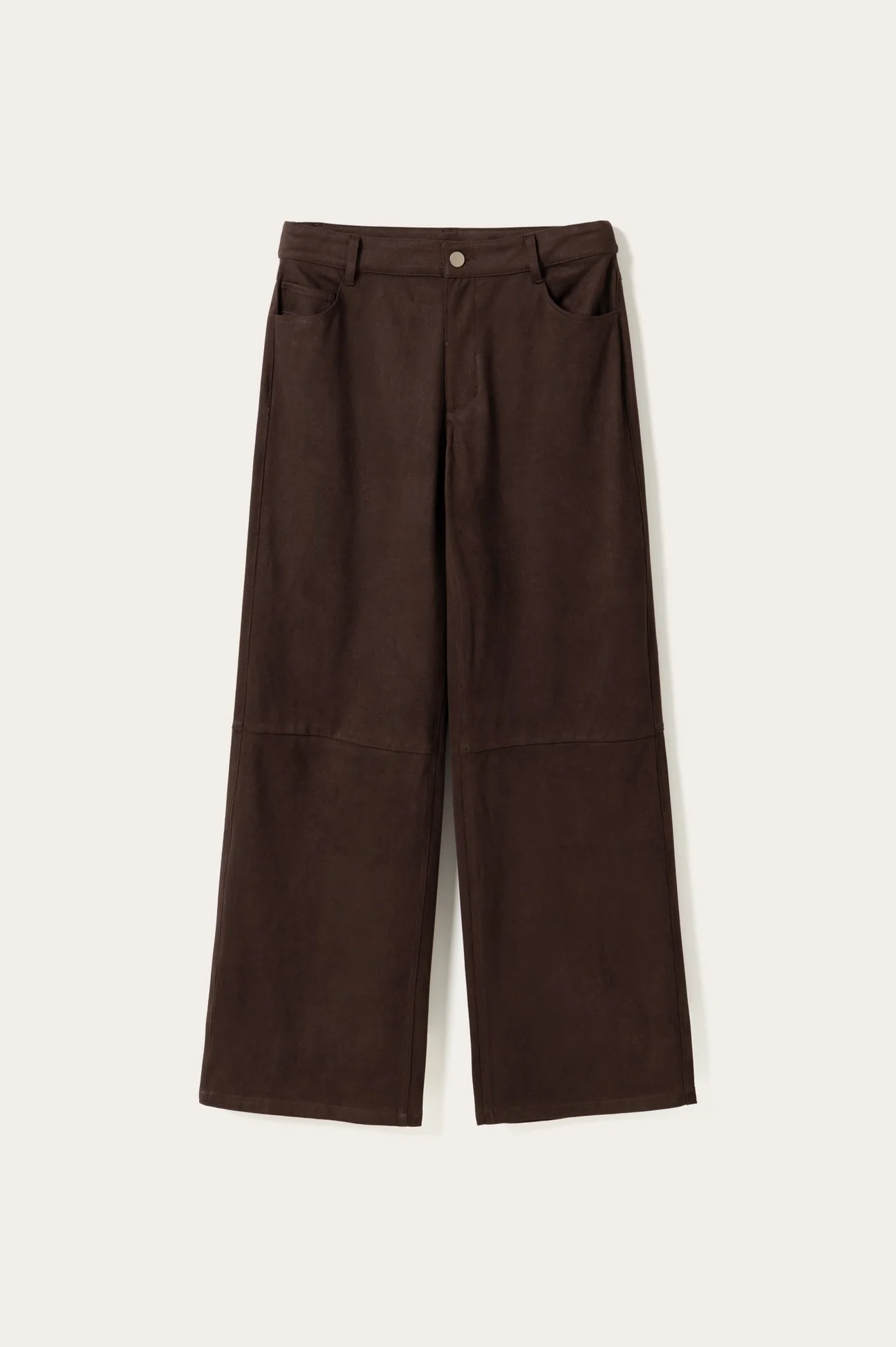 Melo buxurnar eru milliháar (mid-waist) víðar buxur úr efni með gervirúskinnsáferð (faux suede). Þær eru með skurðlínu fyrir neðan hné sem gefur aukna lögun og stílhreint yfirbragð með mjúkri rúskinnsáferð.