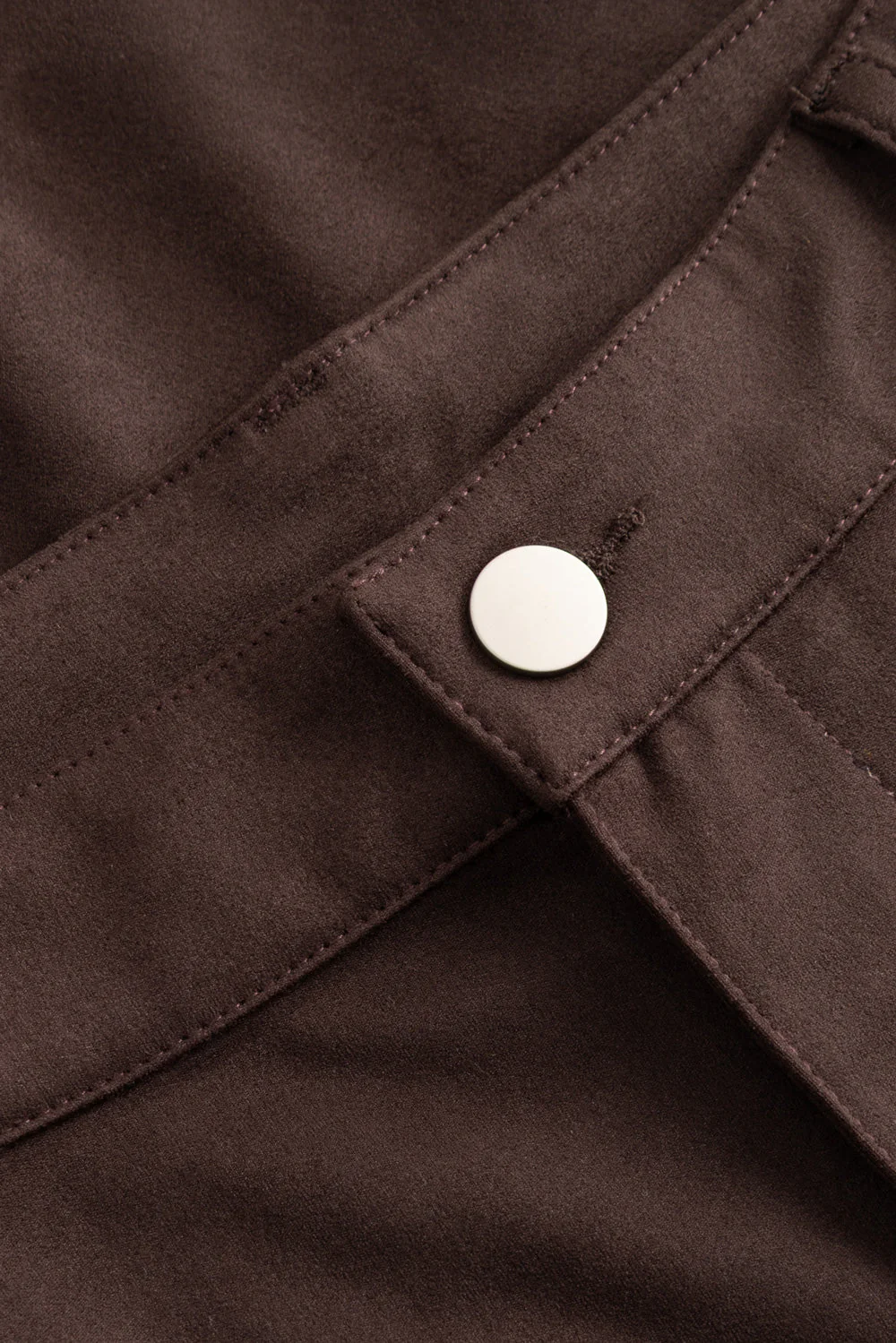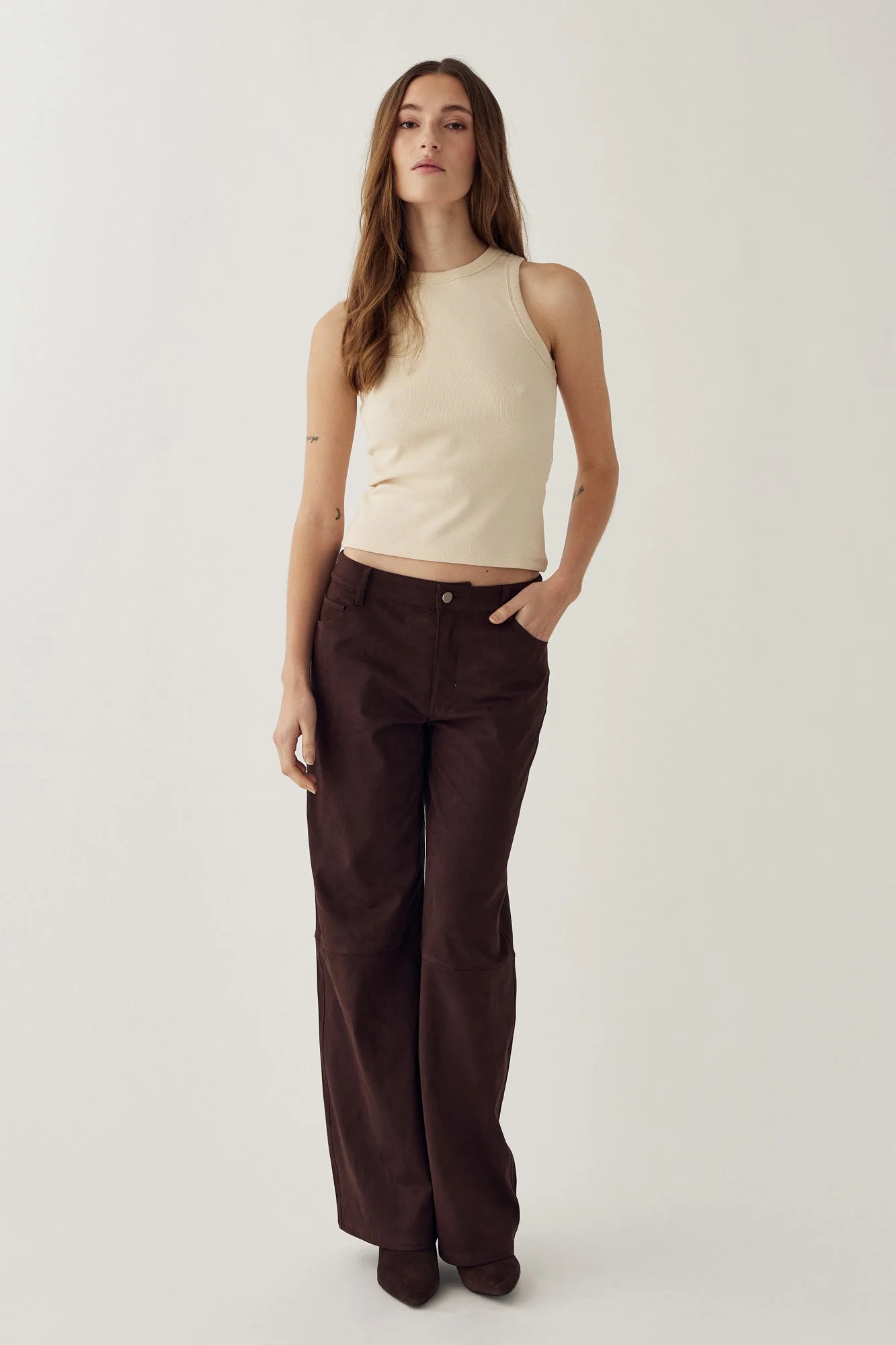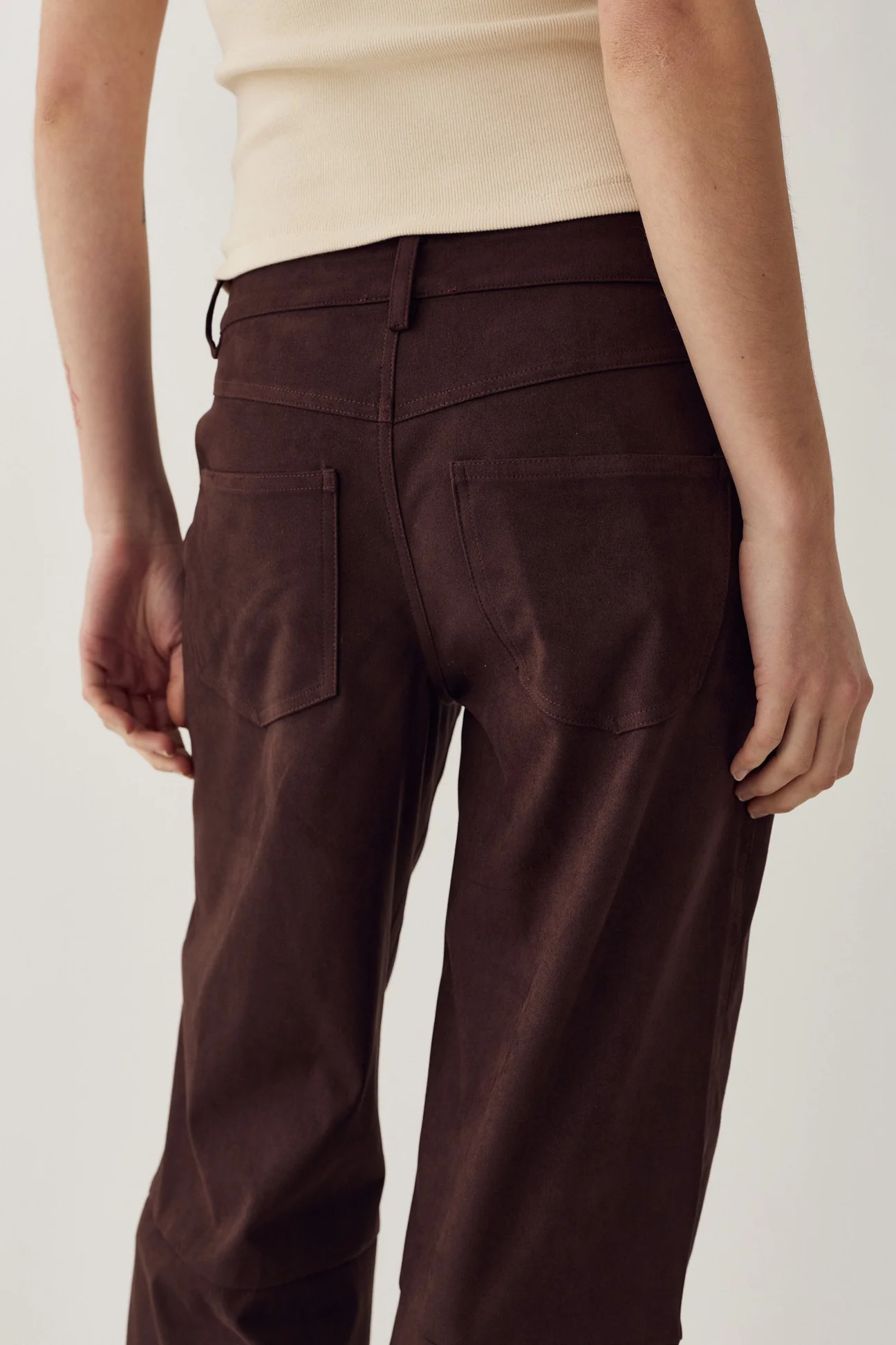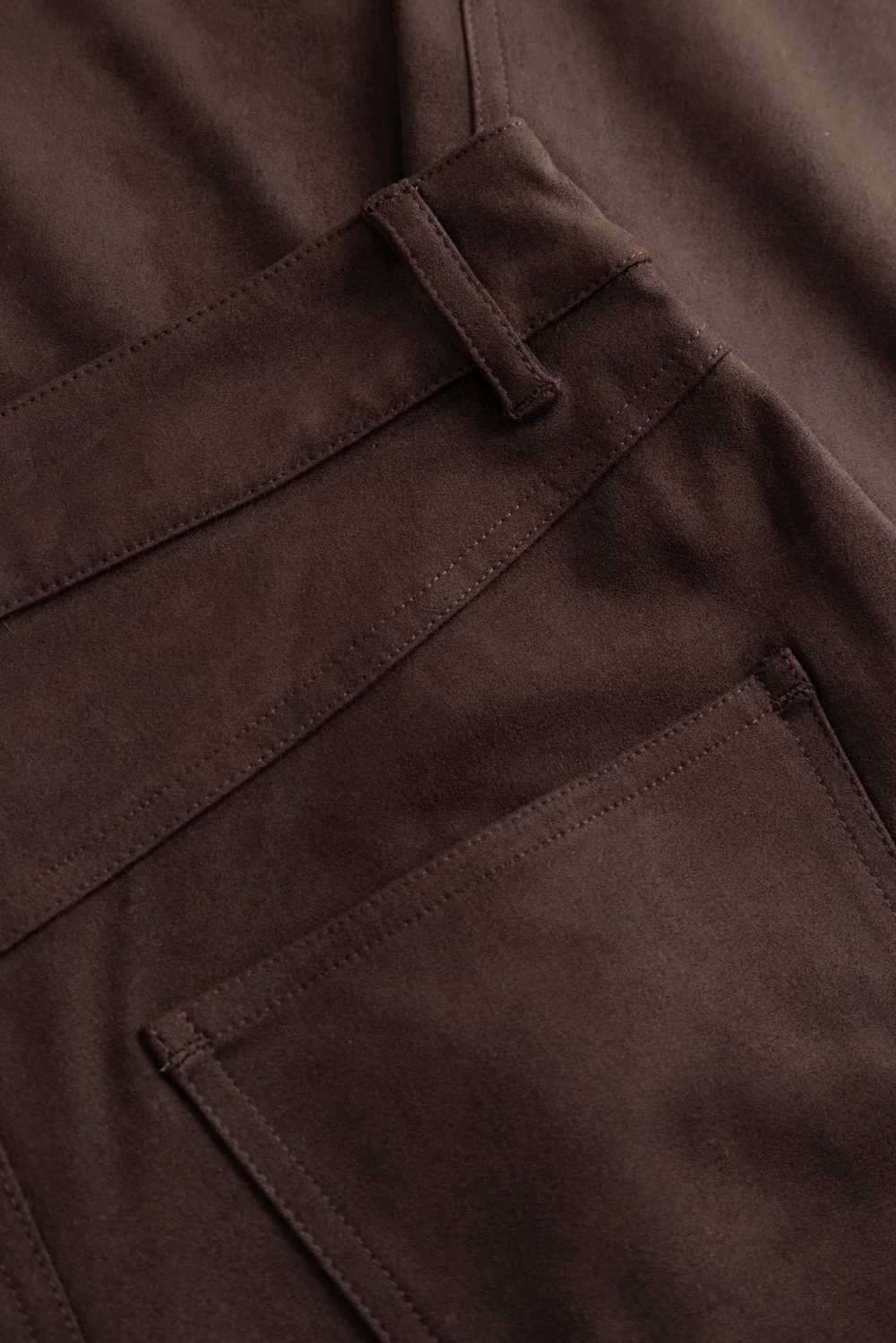 Melo buxurnar eru milliháar (mid-waist) víðar buxur úr efni með gervirúskinnsáferð (faux suede). Þær eru með skurðlínu fyrir neðan hné sem gefur aukna lögun og stílhreint yfirbragð með mjúkri rúskinnsáferð.