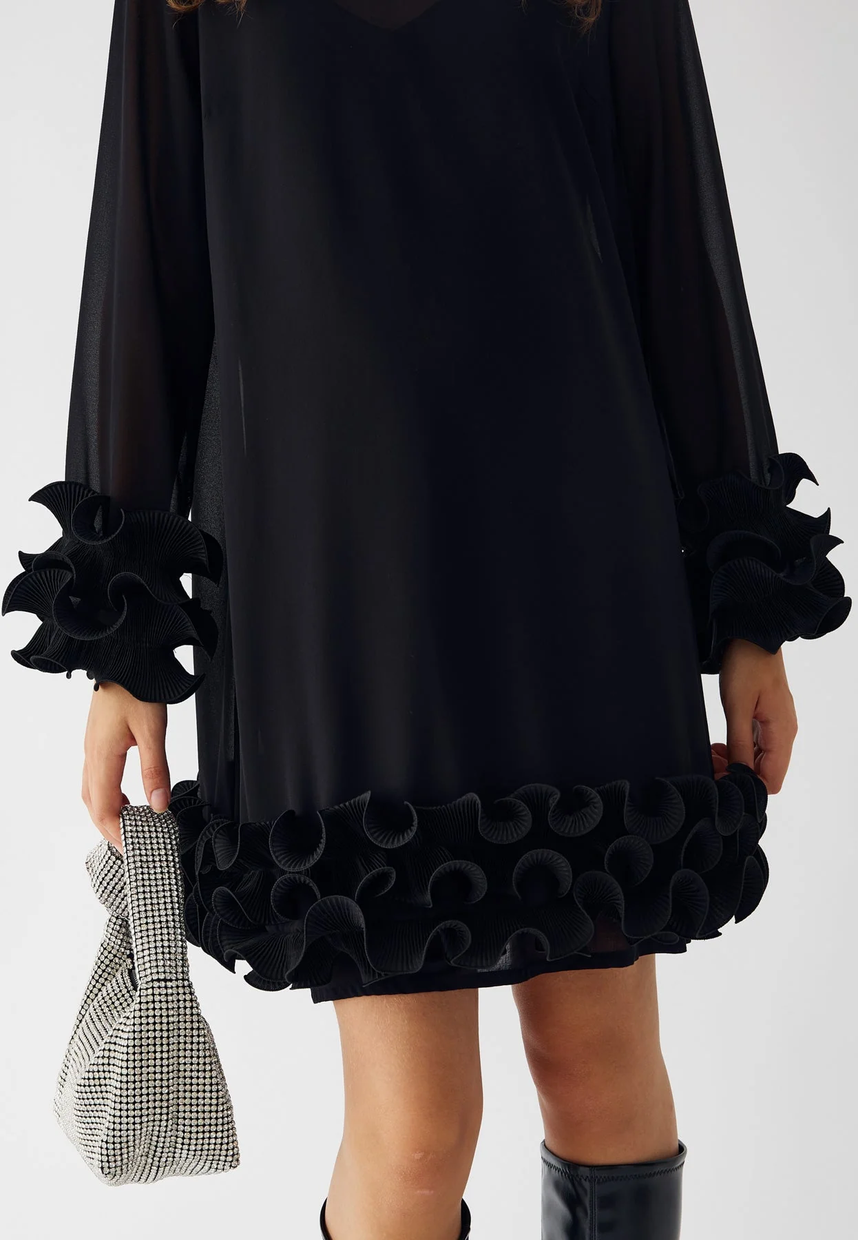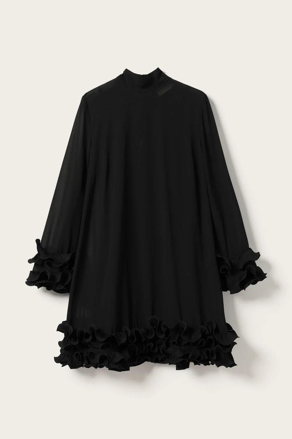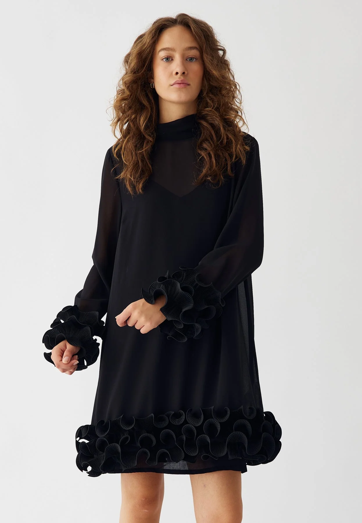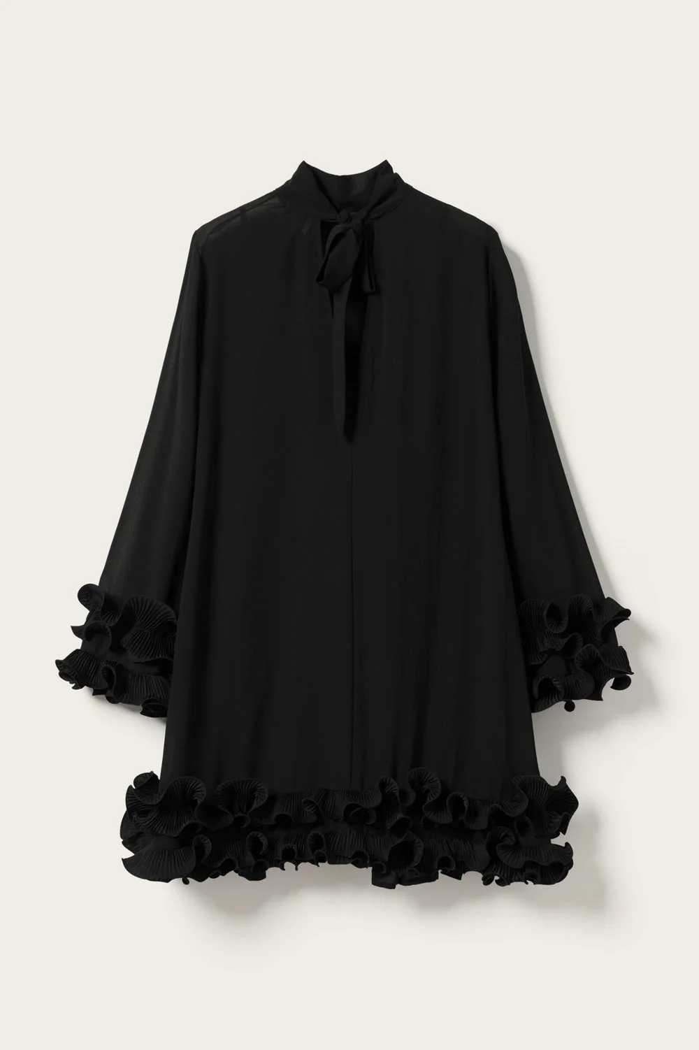 Latania kjóllinn er stuttur svartur kjóll með fíngerðum áferðarvolangi á köntunum. Kjóllinn er laus í sniði með háum, hringlaga hálsmáli og bindiboga í hálsmálinu.