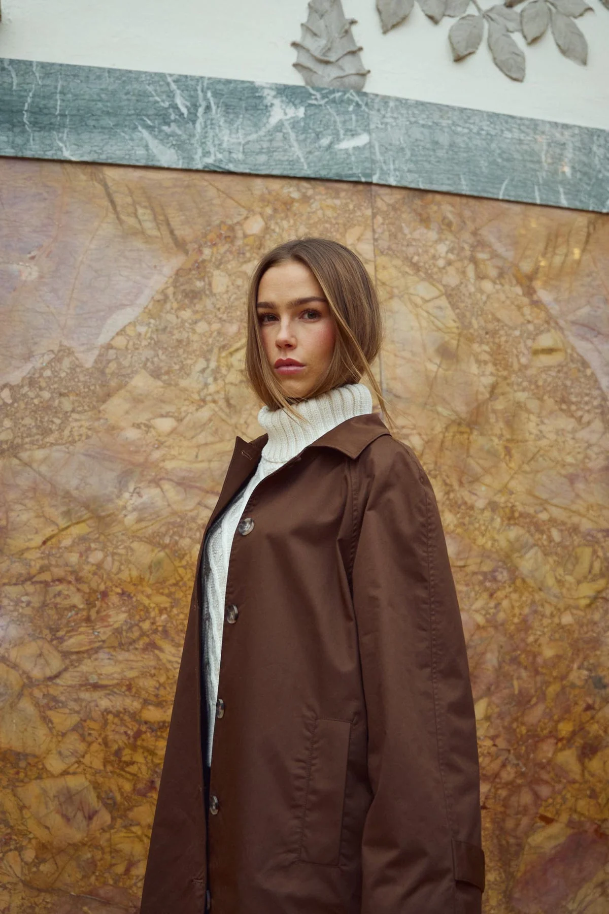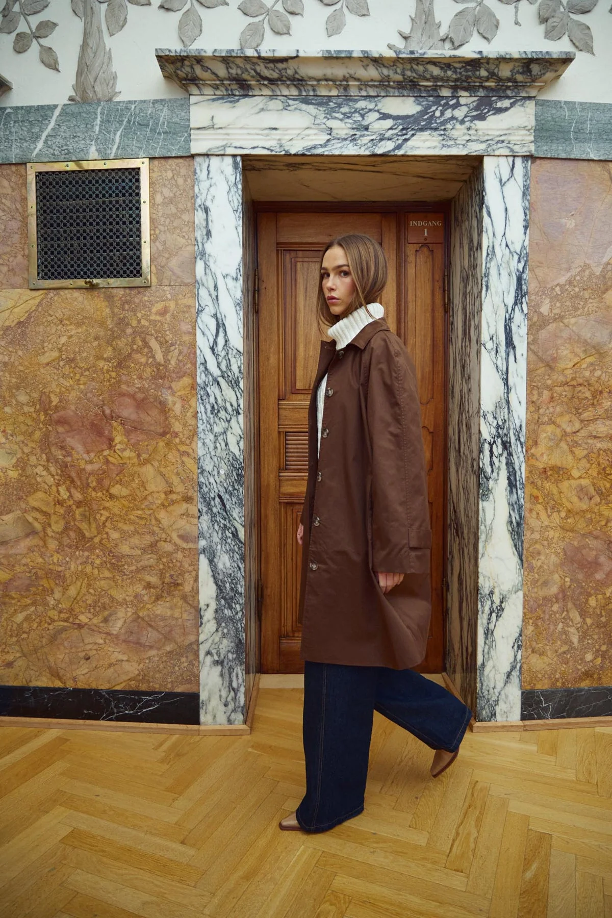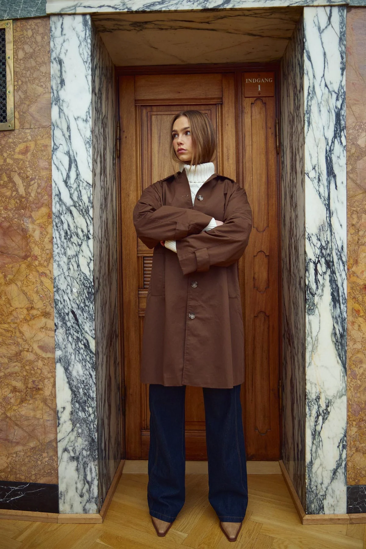 Stílhreinn, síður jakki í yfirbreiðu sniði með hnappaloku. Léttur og fjölhæfur jakki sem hentar vel bæði til hversdags og við fínni tilefni.