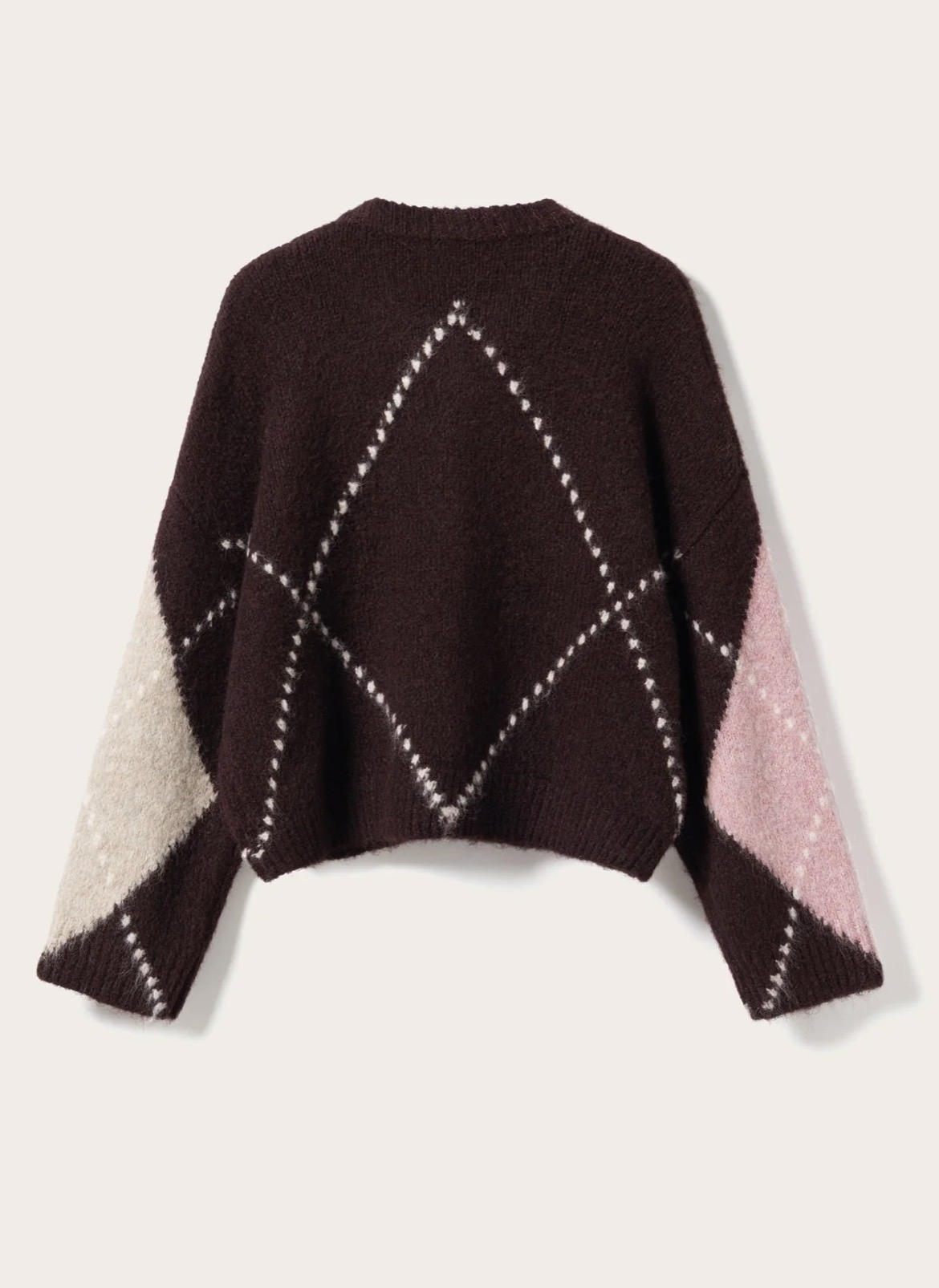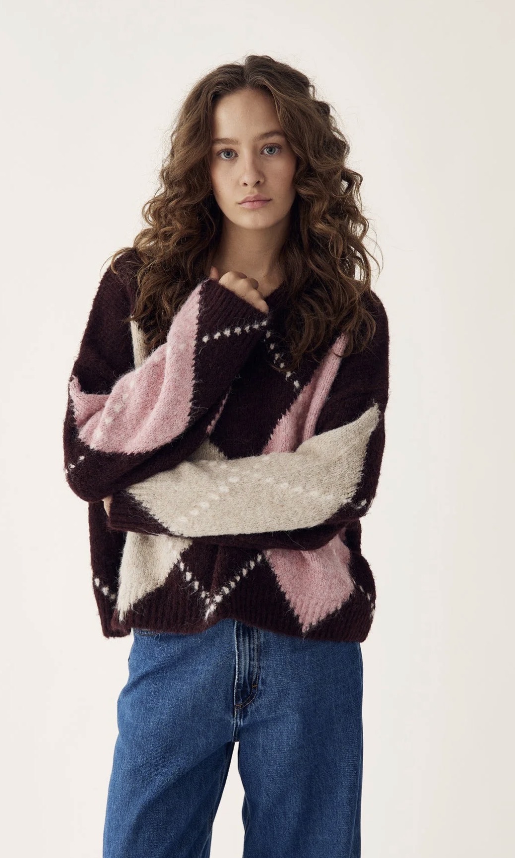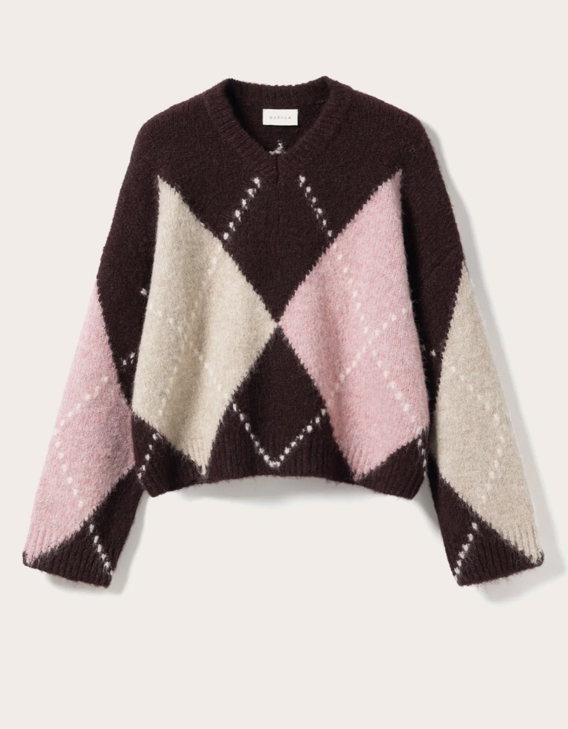 Lai Knit er klassísk peysa með Argyle-mynstri. Hún er hönnuð með V-hálsmáli, löngum og fyrirferðarmiklum ermum og afslöppuðu sniði sem skapar fágað og tímalaust útlit.