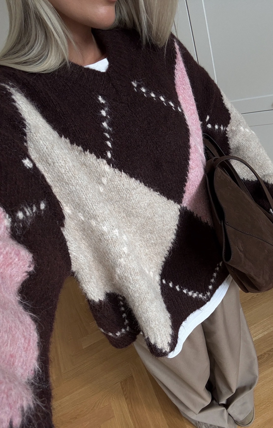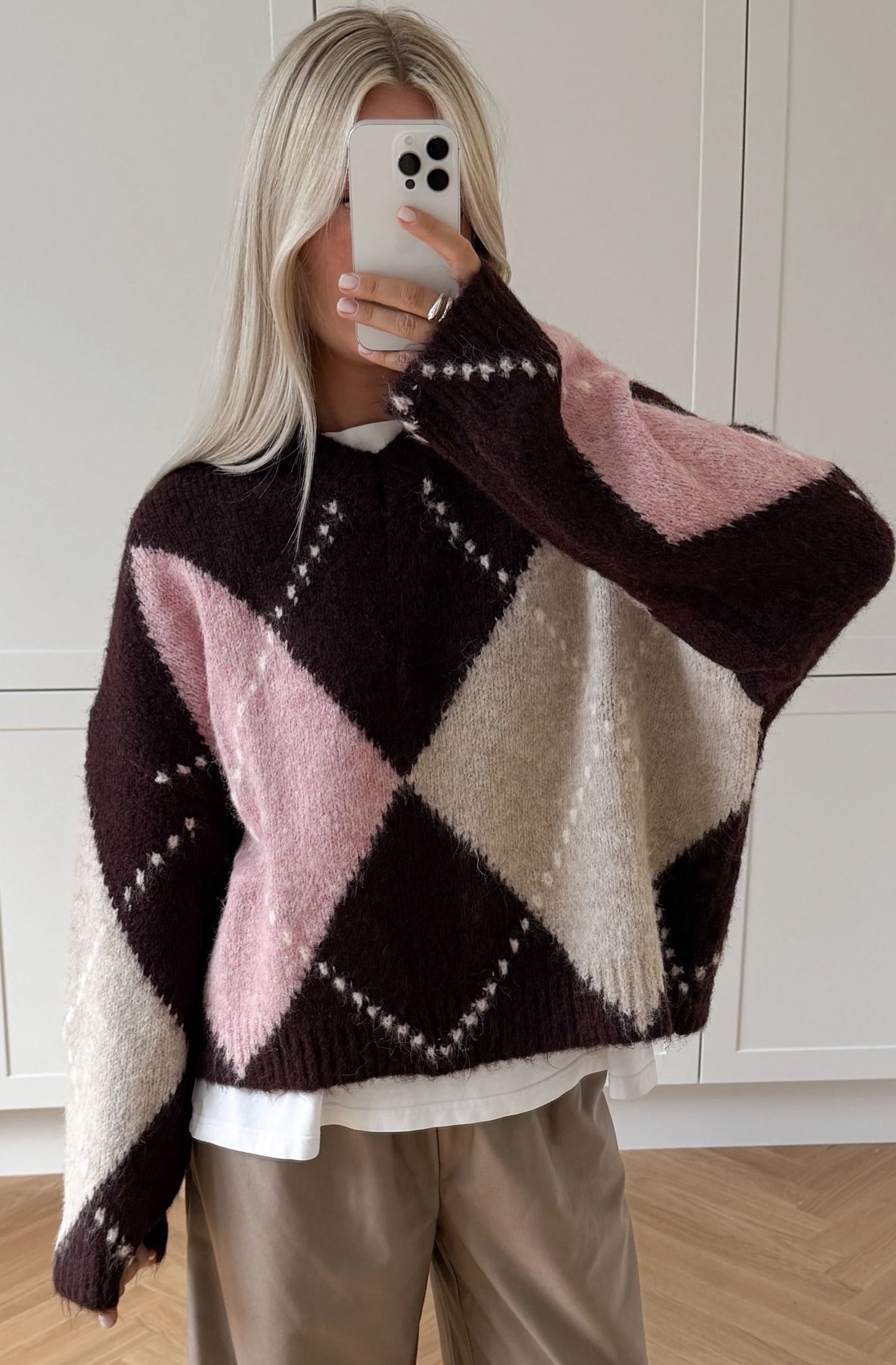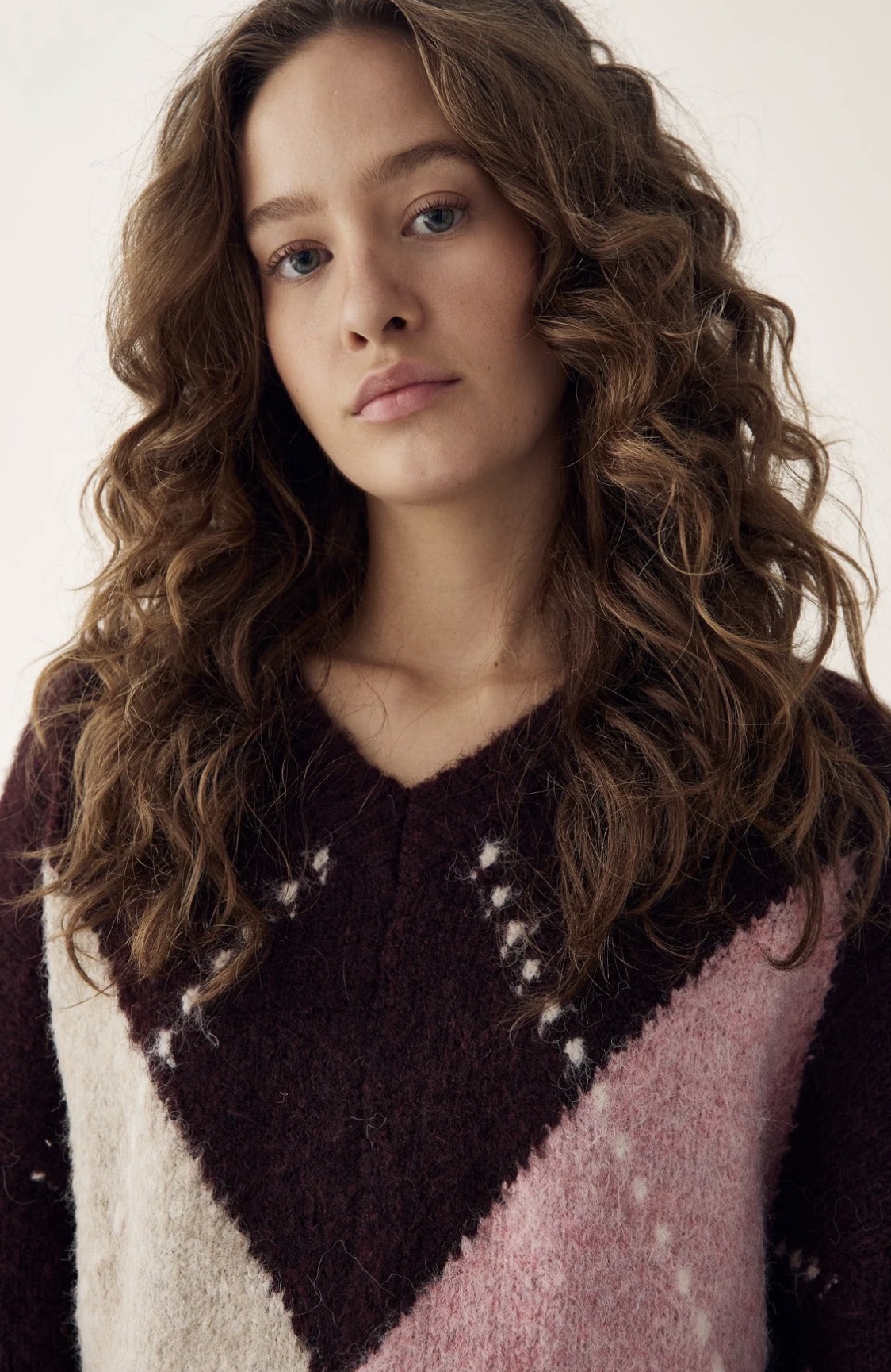 Lai Knit er klassísk peysa með Argyle-mynstri. Hún er hönnuð með V-hálsmáli, löngum og fyrirferðarmiklum ermum og afslöppuðu sniði sem skapar fágað og tímalaust útlit.